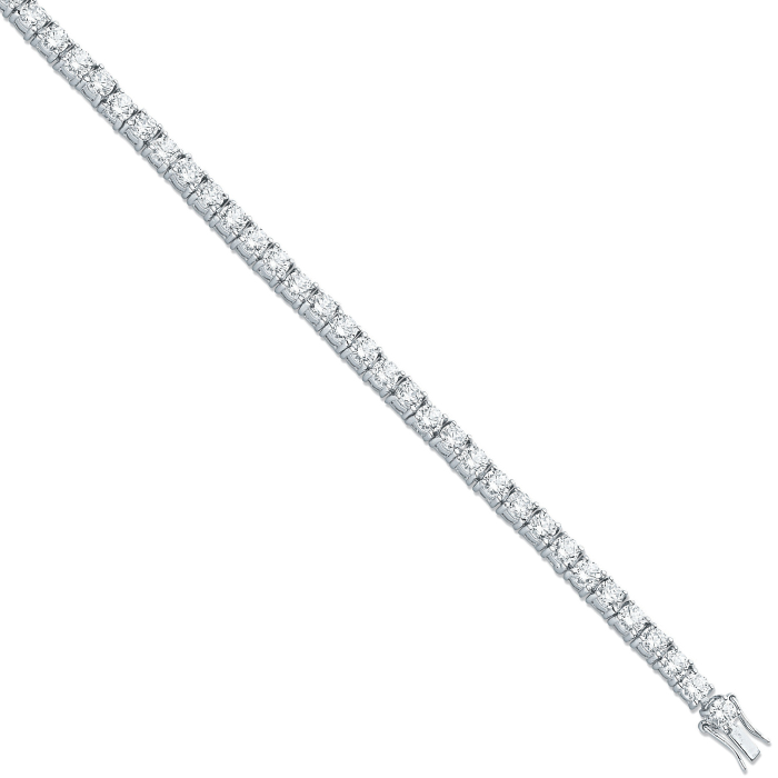 Enhance your look with this Silver 4.3mm CZ Tennis Bracelet, a timeless piece designed for those who love understated luxury. Crafted from .925 sterling silver and rhodium plated for enhanced durability and shine, this bracelet features a row of brilliant 4.3mm round-cut cubic zirconia stones, each expertly set to maximize sparkle and radiance. The classic tennis bracelet design ensures a seamless flow of brilliance around your wrist, making it the perfect accessory for any occasion.
